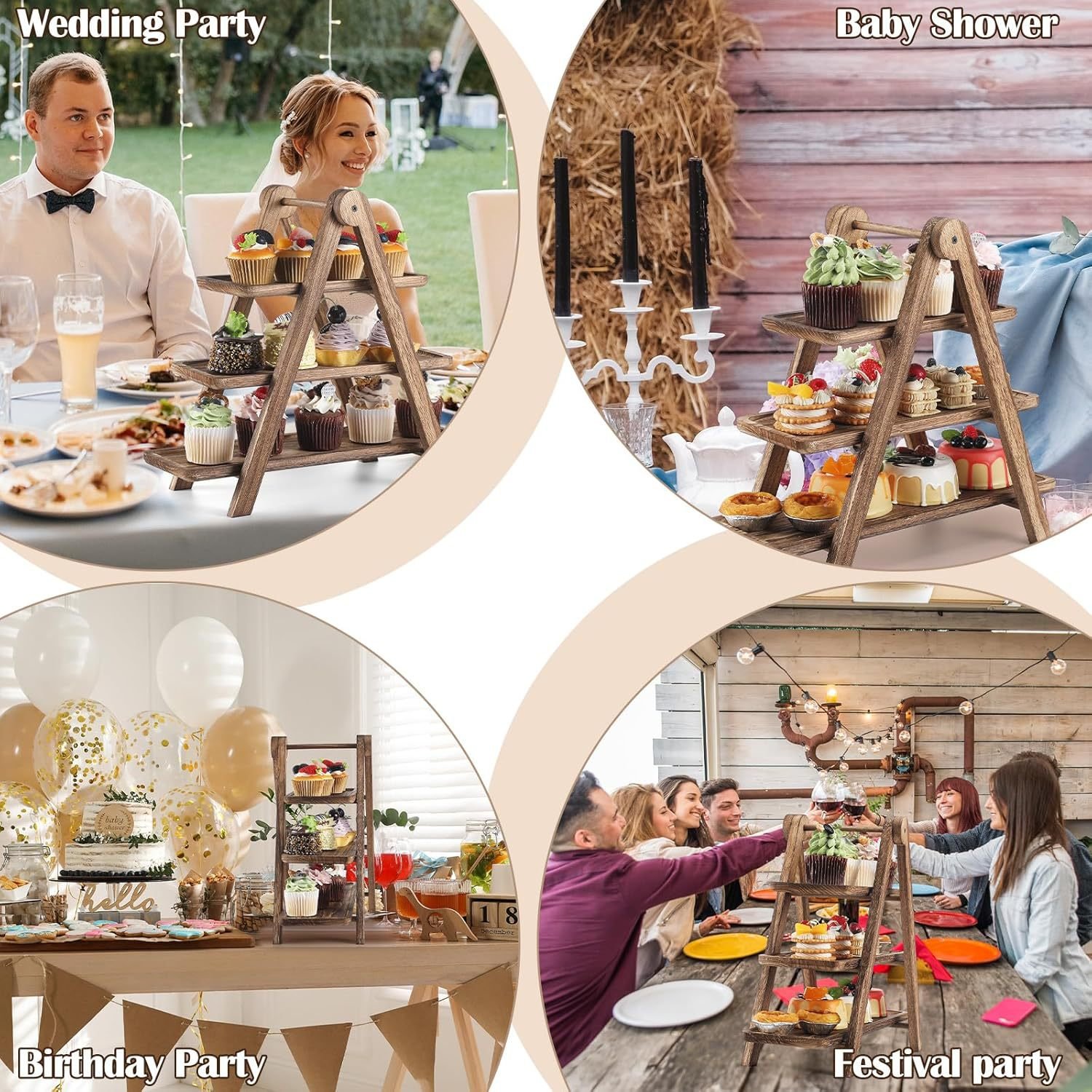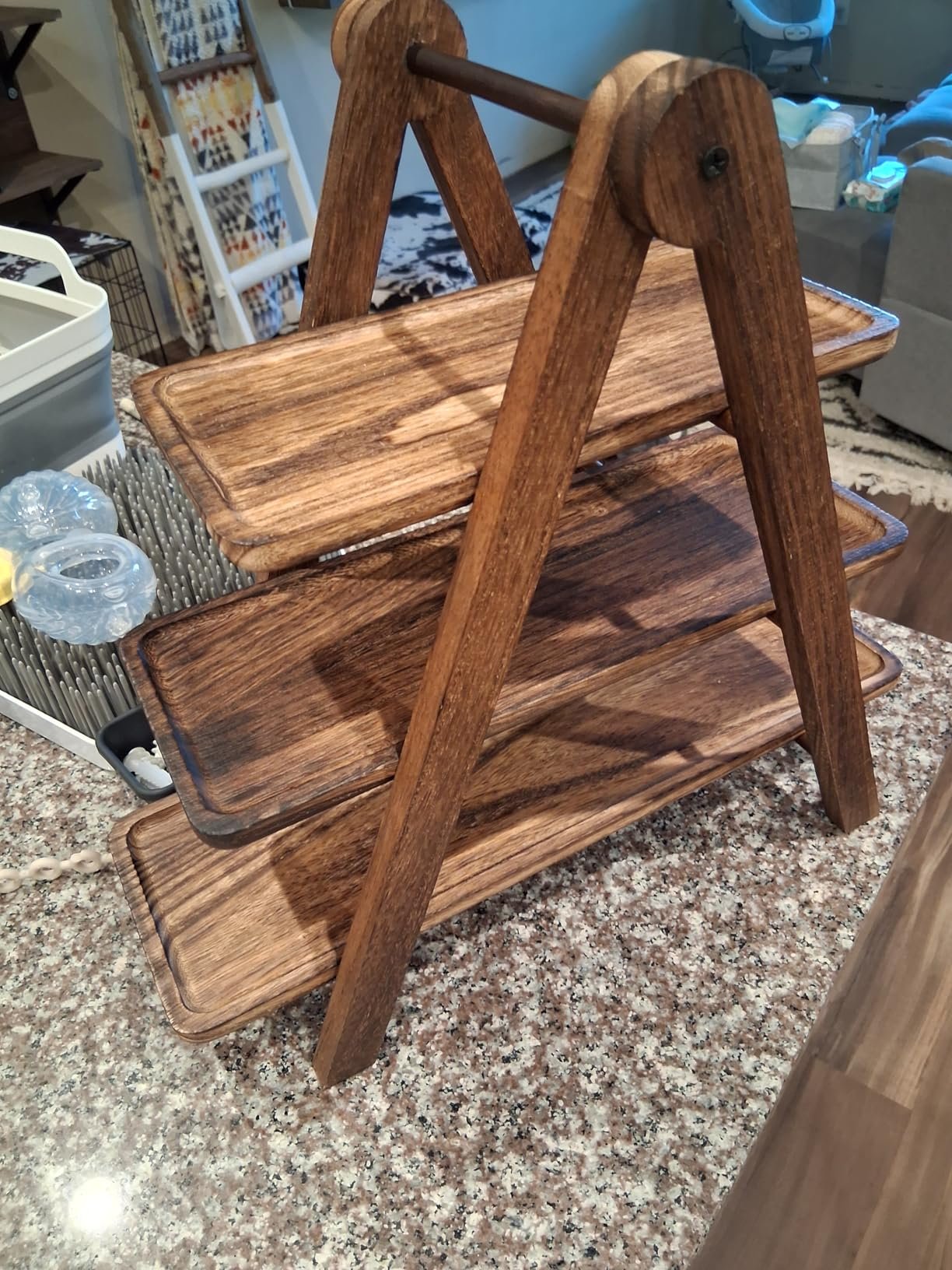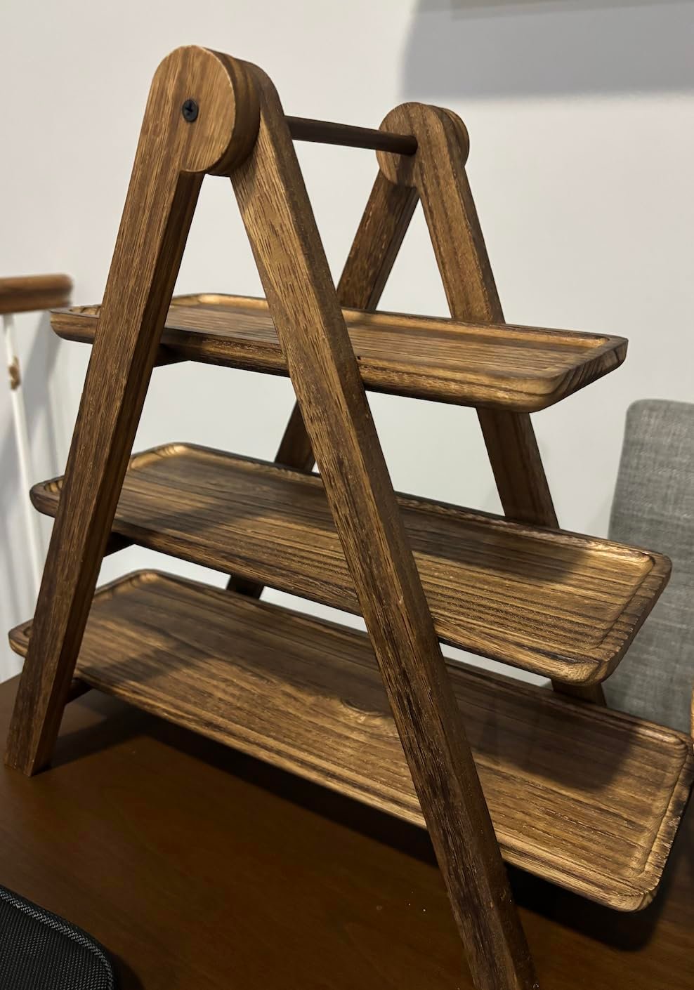 The sturdy wooden rack securely supports all three removable trays, ensuring balance and safety during serving.