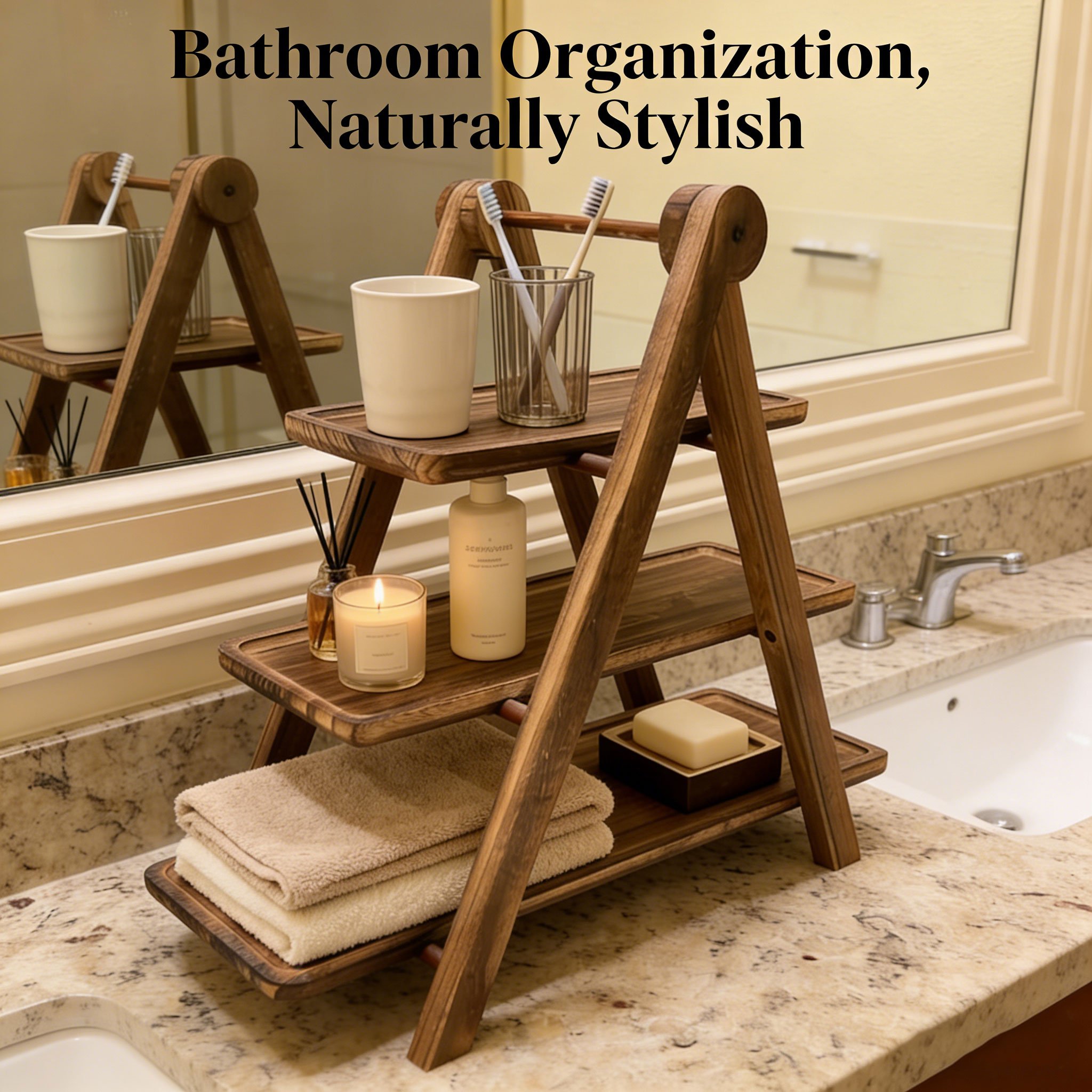1️⃣ Unfold the wooden pyramid rack and place it on a flat, stable surface
