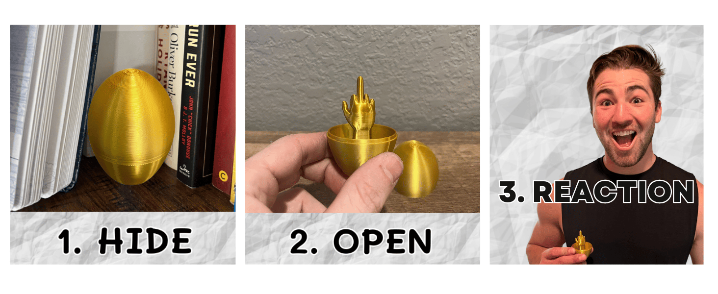 Premium 3D Printed Design - Durable & LongLasting Fun: Crafted with high-quality 3D printing technology, this middle finger egg is made from durable plastic that won’t break or lose its shape, ensuring you can reuse it for multiple pranks and occasions. The smooth finish and precise detailing make it a funny and well-crafted conversation starter. Whether you're using it as a prank gift, a desk ornament, or a stress reliever, this egg is built for lasting entertainment.