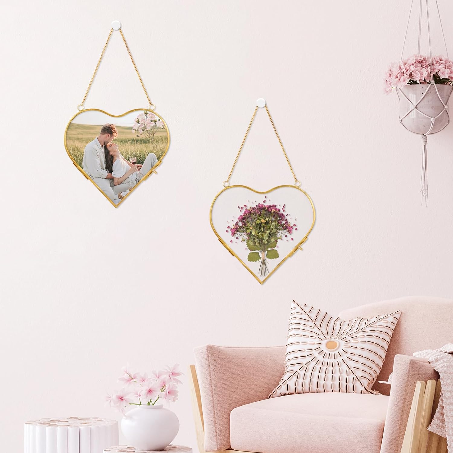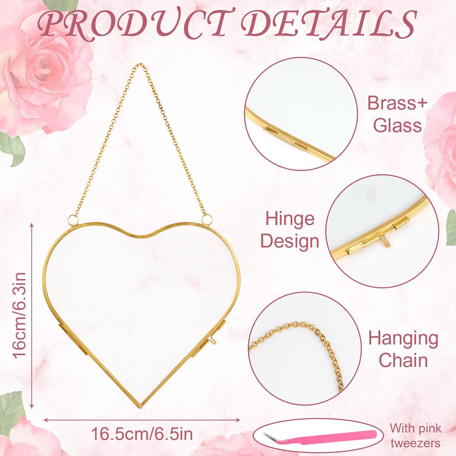 Our pressed flower photo frame is designed with high-quality glass and brass frame, equipped with a metal chain, which can be hung on the wall at home, stylish and simple, adding a touch of elegance to your home