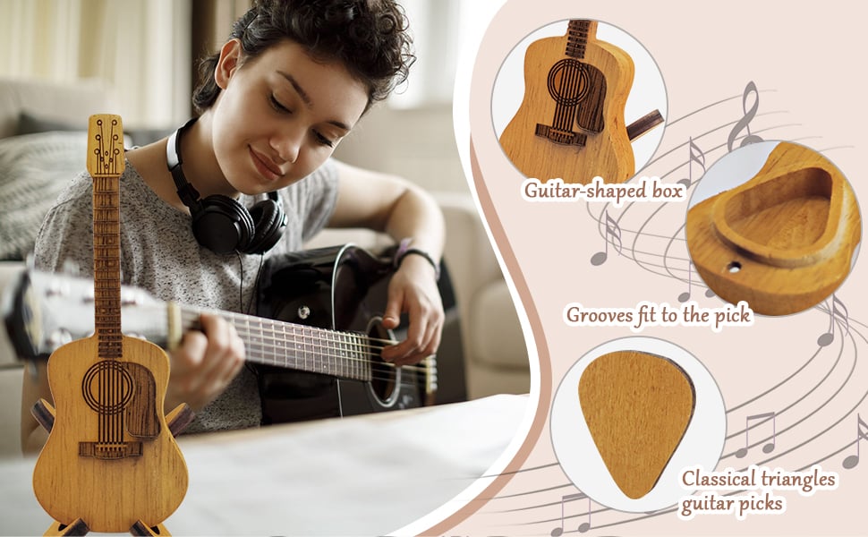 The strings are already engraved on the front of the guitar box.The strings are already engraved on the front of the guitar box.We accurately repeated the beautiful and elegant curves of the acoustic guitar in the box for picks, this box is a miniature copy of the acoustic guitar, will be a great gift.